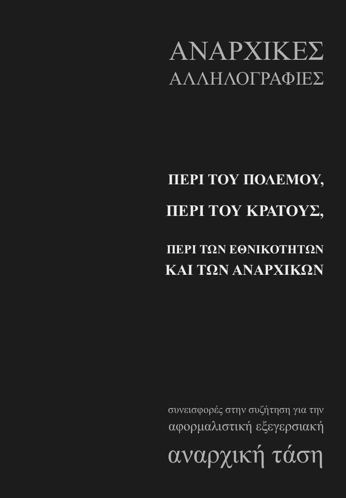 Επειδή λοιπόν, όπου υπάρχει κράτος σήμερα, στην Ευρώπη και αλλού, υπάρχουν επίσης και καταπιεσμένες εθνότητες, και εμείς οι αναρχικοί το γνωρίζουμε πολύ καλά αυτό το πράγμα, να πιστοποιήσουμε ότι αντιστοιχεί στην πραγματικότητα το γεγονός ότι ο όρος- έννοια κράτος είναι απλό συνώνυμο του «έθνους» μου φαίνεται, πρωτίστως για εμάς τους αναρχικούς, μια πράξη που πρέπει σε κάθε περίπτωση να αποφύγουμε. Δεν θα ήταν ίσως πιο σωστό να αρκεστούμε στην πραγματικότητα των γεγονότων και να αποδώσουμε στο κράτος αυτό που πράγματι του ανήκει και στο «έθνος», ή καλύτερα στην «εθνικότητα», αυτό ακριβώς που είναι δικό της; Με αυτό τον τρόπο αποφεύγουμε σίγουρα να συνεχίσουμε να αναπαράγουμε την εσκεμμένη σύγχυση που προκαλεί σκόπιμα το κράτος και, ταυτόχρονα καθίσταται ανεπίστρεπτα σαφής η ίδια η αναρχική προοπτική που έχει στόχο να αξιοποιήσει τον αυτοκαθορισμό (που παραμένει ανολοκλήρωτος) των ατόμων και των κοινοτήτων, όσο μικρές ή μεγάλες ποσοτικά κι αν είναι αυτές, πολύ πιο πέρα δηλαδή από τα άτυπα ή τυπικά σύνορα που θεσπίζουν τα κράτη.